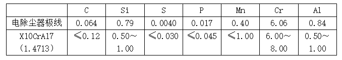 电除尘器极线的化学成分分析结果表明,该极线的成分符合德国DIN标准对耐热钢X10CrAl7的要求(见表1)。